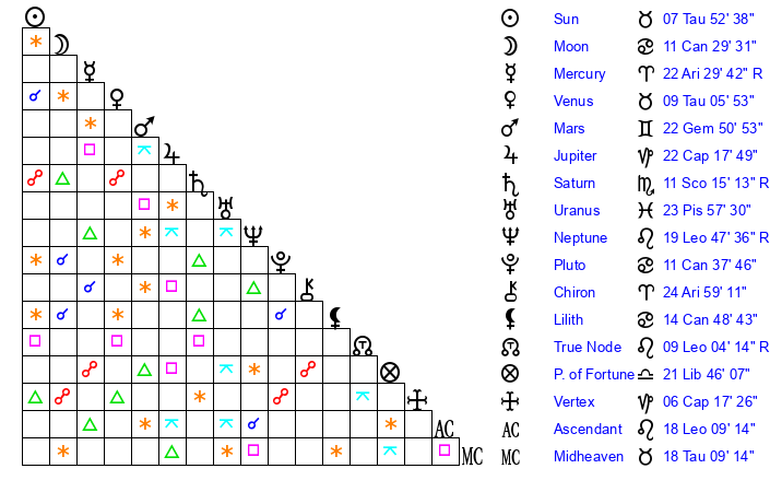 | Moon | 11 Cancer 27 | 21 Taurus 28 | 14 Pisces 31 |