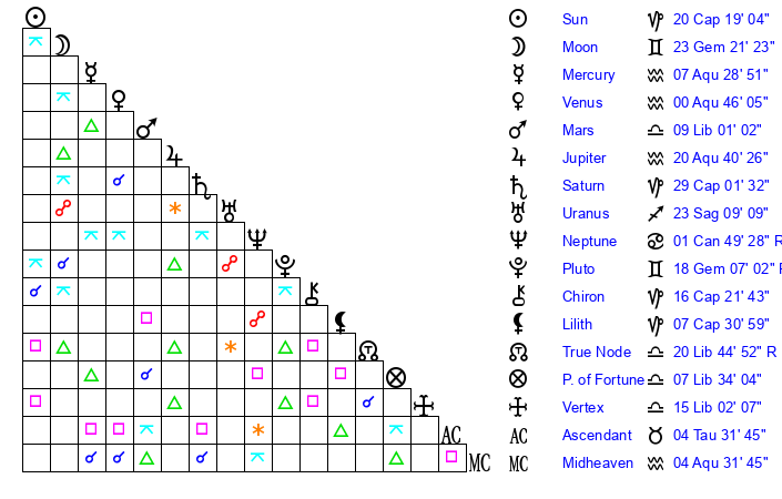 | Pluto | 18 Gemini 7 | 1 Aquarius 24 | 18 Gemini 32 |