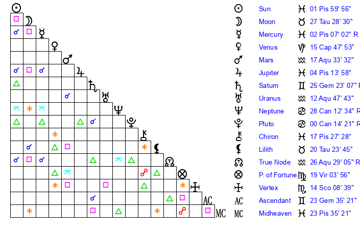 | Moon | 27 Taurus 24 | 14 Sagittarius 3 | 7 Gemini 50 |