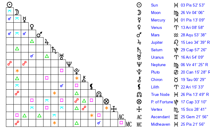 | Sun | 3 Pisces 53 | 5 Pisces 20 | 5 Gemini 12 |