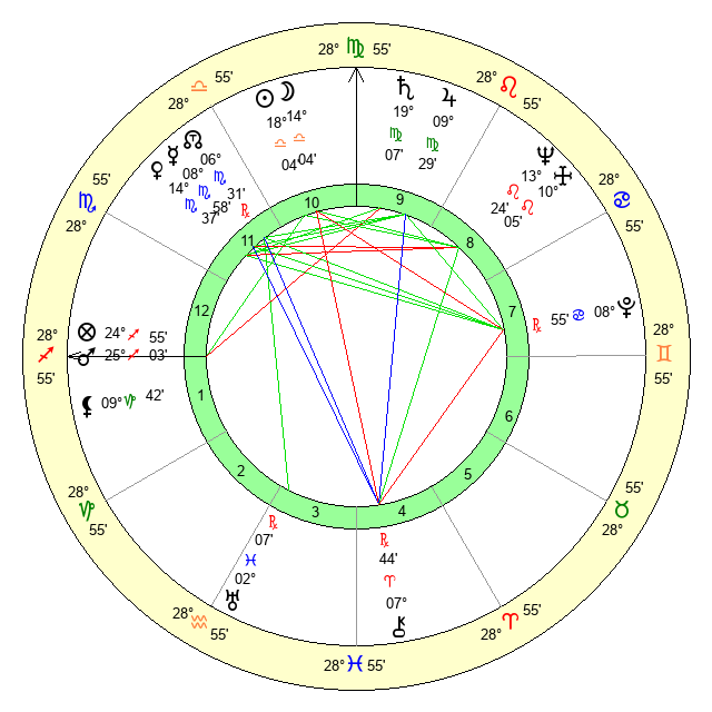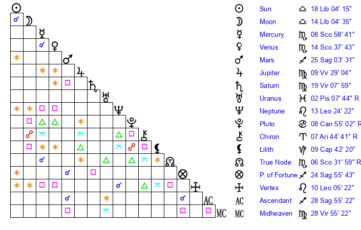| Moon | 13 Libra 58 | 21 Gemini 40 | 14 Leo 49 |