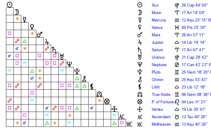 | Sun | 26 Capricorn 44 | 27 Capricorn 50 | 21 Taurus 4 |