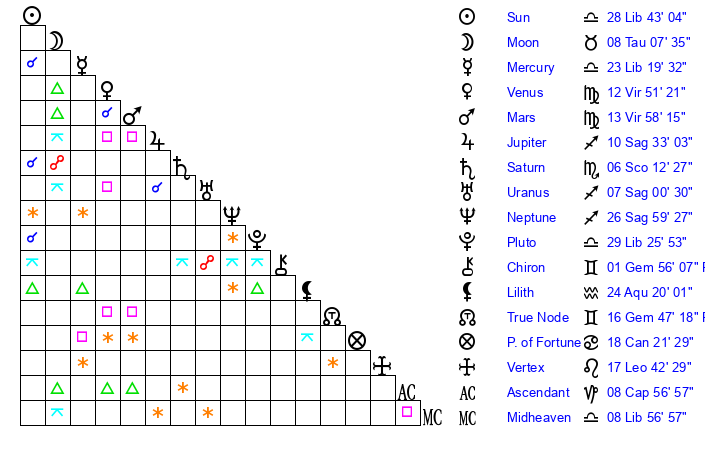 | Sun | 28 Libra 43 | 29 Libra 33 | 10 Sagittarius 58 |