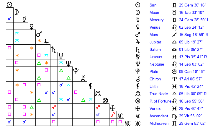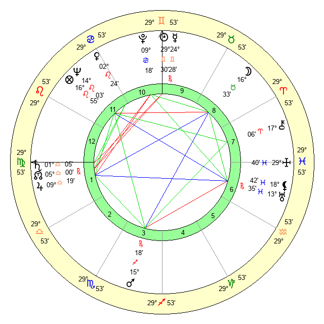 | Sun | 29 Gemini 30 | 0 Cancer 34 | 8 Libra 42 |
