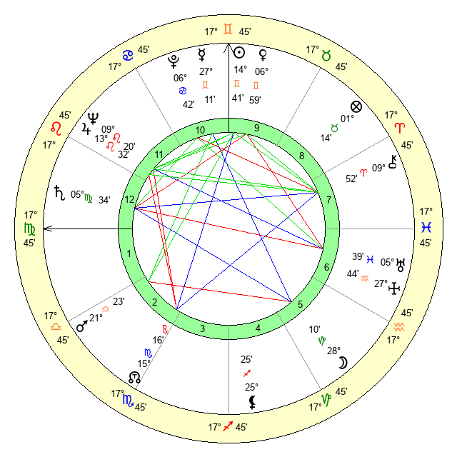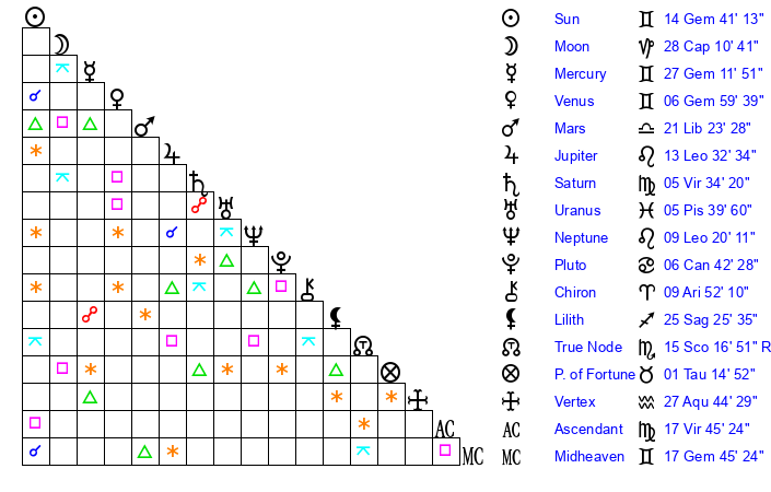 | Sun | 14 Gemini 41 | 15 Gemini 17 | 25 Virgo 27 |