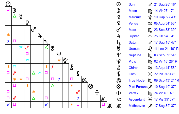 | Saturn | 17 Sagittarius 41 | 25 Pisces 17 | 24 Sagittarius 31 |