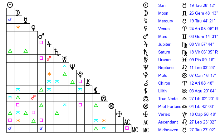 | Moon | 26 Gemini 52 | 28 Libra 28 | 13 Aries 57 |