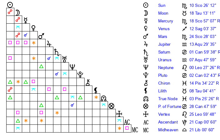 | Sun | 10 Scorpio 26 | 11 Scorpio 31 | 3 Pisces 0 |