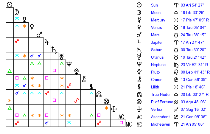 | Sun | 3 Aries 54 | 4 Aries 18 | 26 Gemini 19 |