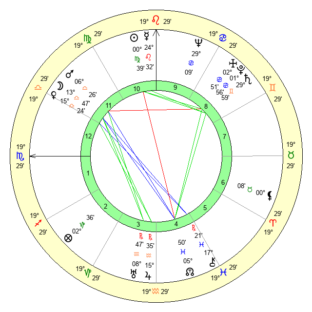 | Moon | 13 Libra 43 | 18 Virgo 54 | 3 Scorpio 36 |