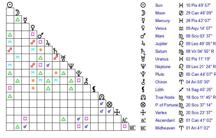 | Neptune | 9 Leo 21 | 28 Pisces 55 | 9 Leo 34 |