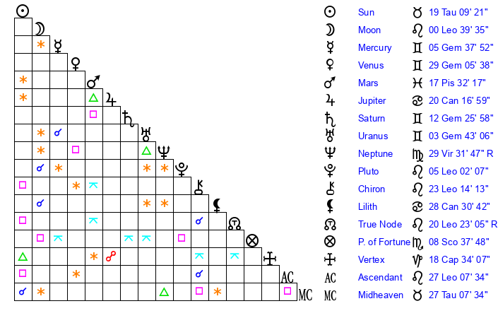 | Sun | 19 Taurus 9 | 20 Taurus 17 | 7 Leo 36 |