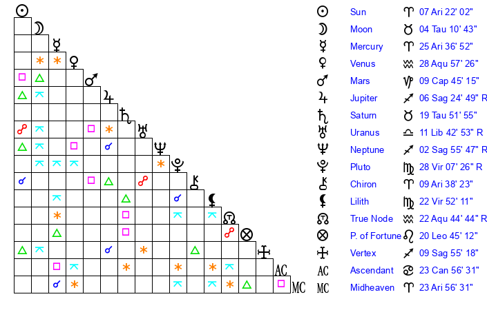 | Saturn | 20 Taurus 6 | 24 Pisces 1 | 26 Taurus 42 |