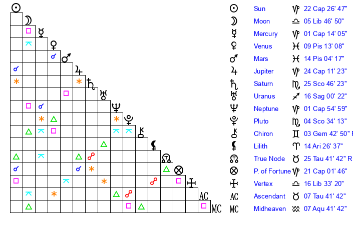 | Moon | 5 Libra 39 | 7 Cancer 18 | 24 Pisces 34 |