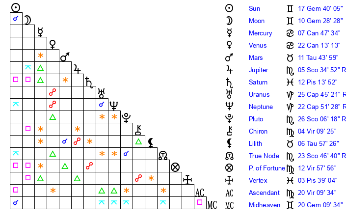 Sun | 17 Gemini 40 | 18 Gemini 9 | 17 Cancer 15 |