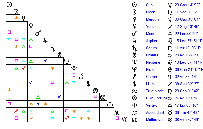 | Neptune | 10 Leo 36 | 27 Pisces 32 | 8 Leo 45 |