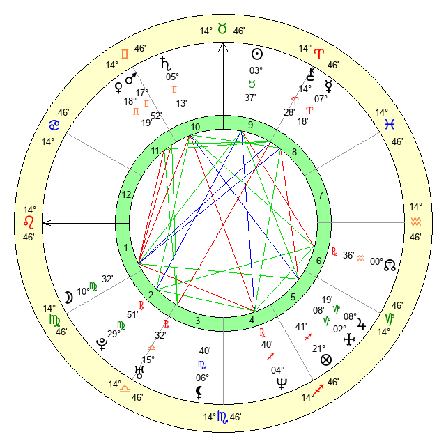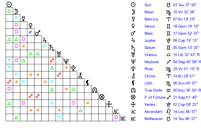 | Moon | 10 Virgo 30 | 6 Pisces 54 | 20 Leo 15 |