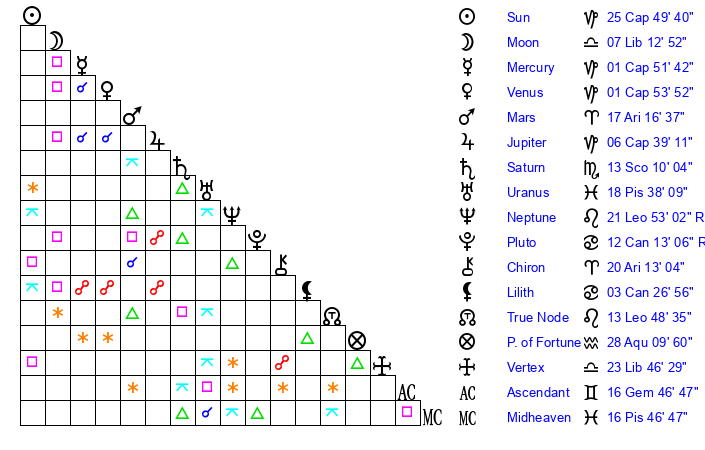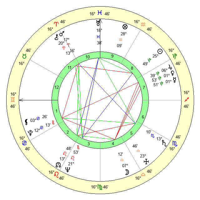 | Moon | 7 Libra 10 | 26 Leo 54 | 14 Gemini 32 |