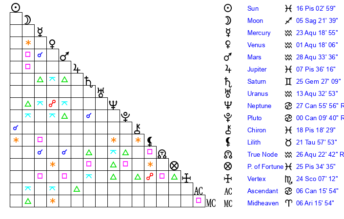| Sun | 16 Pisces 3 | 17 Pisces 22 | 3 Cancer 2 |