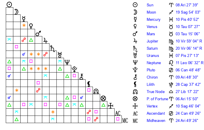 | Saturn | 20 Virgo 52 | 24 Pisces 8 | 20 Virgo 48 |