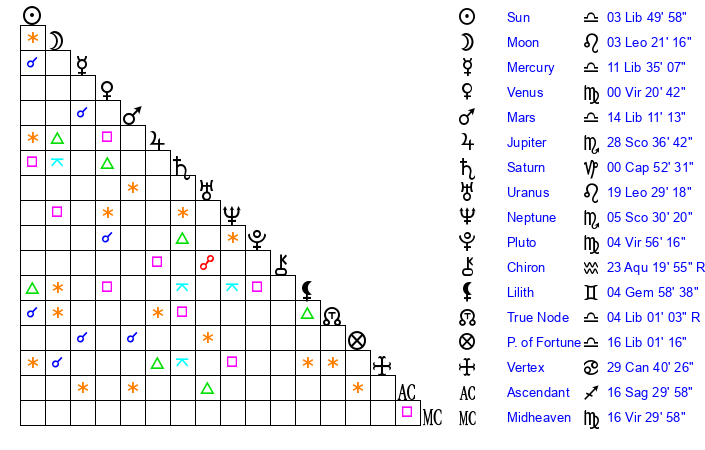 | Moon | 3 Leo 17 | 9 Sagittarius 37 | 12 Capricorn 55 |