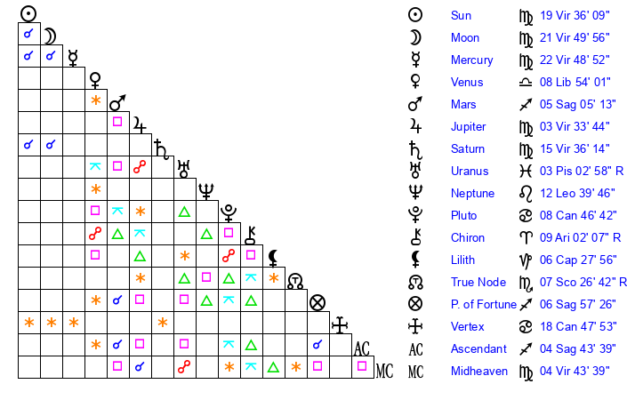 | Mercury | 22 Virgo 49 | 19 Virgo 31 | 22 Sagittarius 41 |