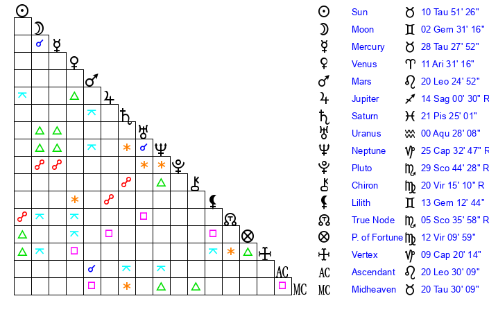 Sun | 10 Taurus 51 | 11 Taurus 34 | 9 Gemini 46 |
