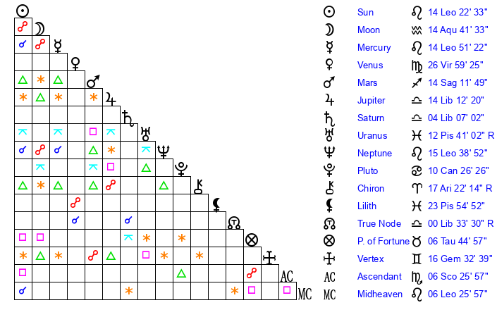 | Neptune | 15 Leo 38 | 1 Aries 52 | 18 Leo 10 |