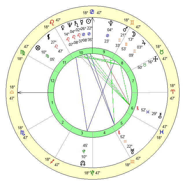 | Sun | 22 Cancer 35 | 23 Cancer 27 | 7 Scorpio 42 |