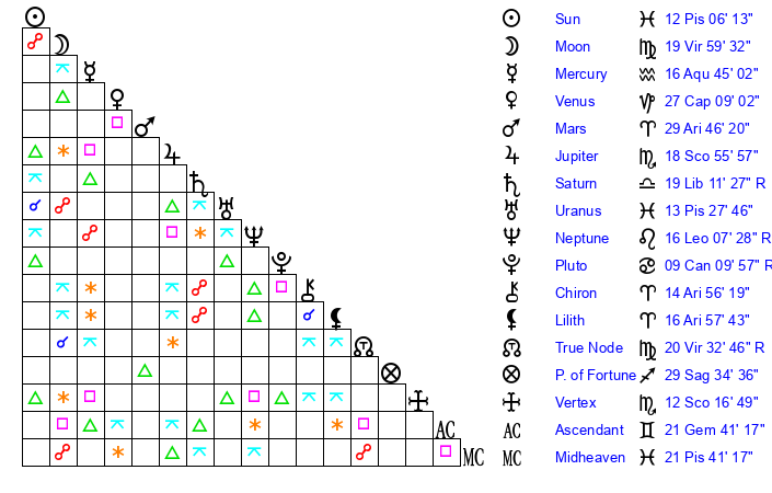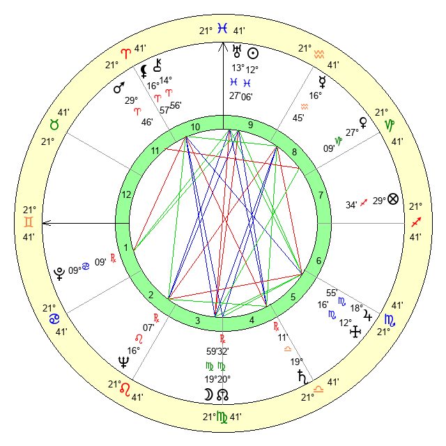 | Sun | 12 Pisces 6 | 13 Pisces 22 | 21 Gemini 38 |