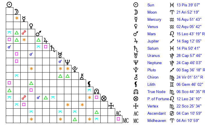 Mercury | 16 Aquarius 51 | 1 Aries 54 | 2 Aries 35 |