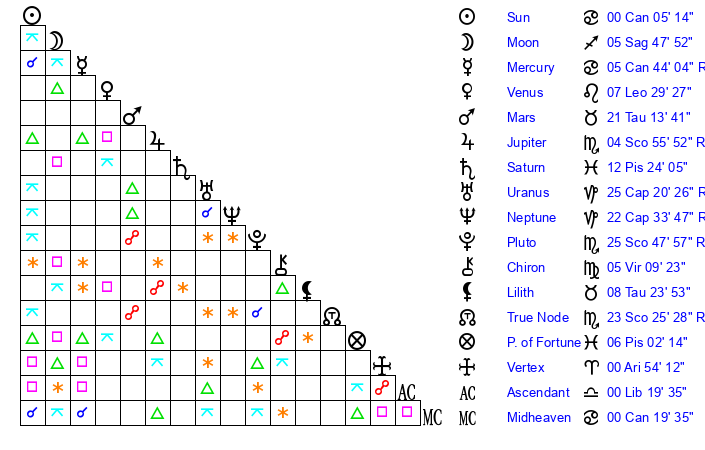 Moon | 5 Sagittarius 51 | 9 Taurus 9 | 27 Capricorn 50 |