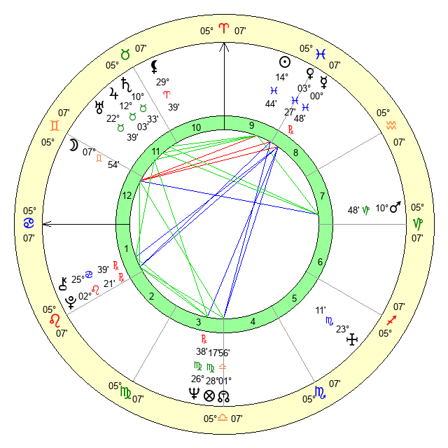 | Moon | 7 Gemini 45 | 2 Gemini 39 | 4 Cancer 55 |