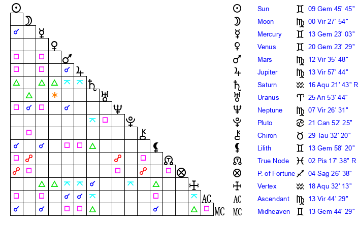 | Sun | 9 Gemini 46 | 10 Gemini 29 | 7 Virgo 49 |
