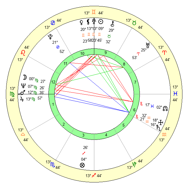 | Moon | 0 Virgo 23 | 11 Leo 44 | 21 Capricorn 35 |