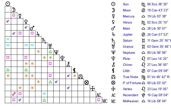 | Neptune | 0 Libra 57 | 29 Pisces 48 | 1 Libra 59 |