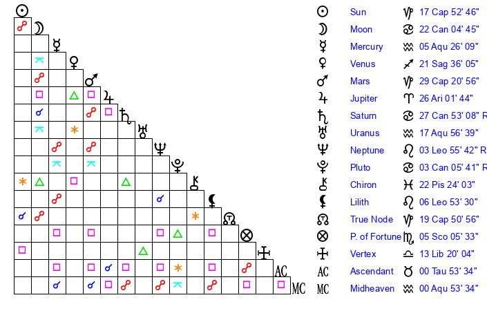 | Uranus | 17 Aquarius 54 | 27 Taurus 46 | 23 Aquarius 16 |