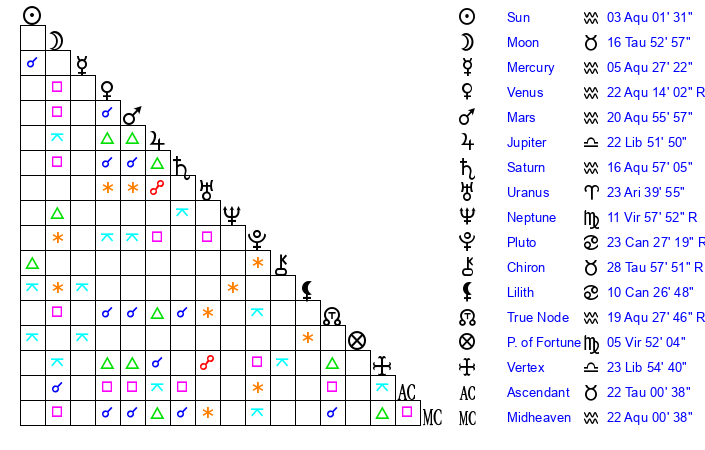 | Mars | 20 Aquarius 56 | 23 Cancer 15 | 1 Taurus 32 |