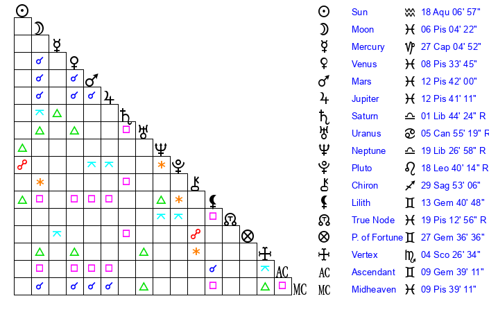 | Saturn | 2 Libra 17 | 18 Pisces 6 | 27 Virgo 12 |