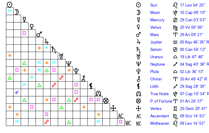 | Moon | 10 Capricorn 10 | 5 Pisces 50 | 8 Sagittarius 48 |