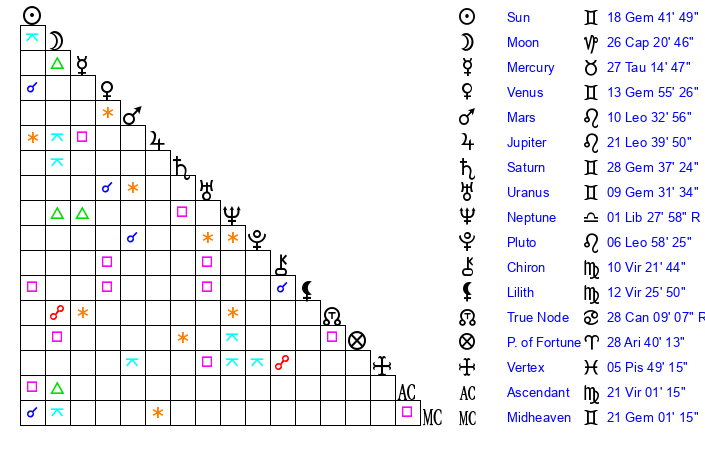 | Sun | 18 Gemini 42 | 19 Gemini 6 | 6 Virgo 12 |