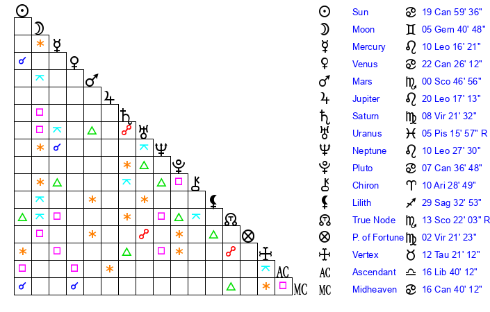 | Sun | 20 Cancer 0 | 20 Cancer 36 | 1 Scorpio 59 |