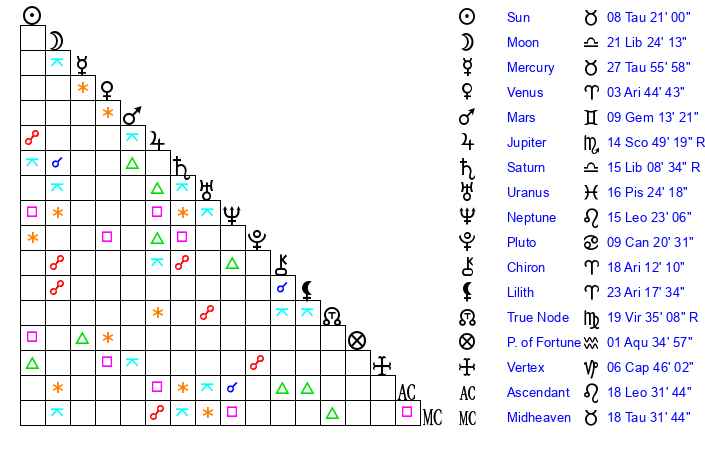 | Sun | 8 Taurus 21 | 9 Taurus 38 | 16 Leo 4 |