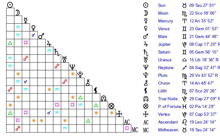 | Moon | 22 Scorpio 17 | 6 Gemini 33 | 4 Scorpio 6 |