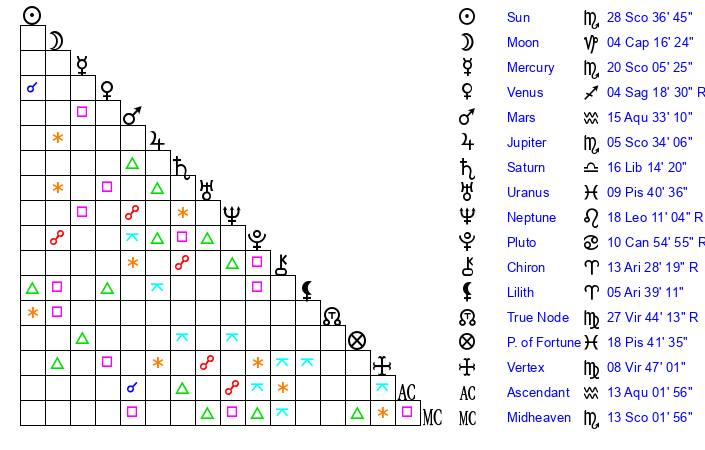 | Sun | 28 Scorpio 36 | 29 Scorpio 38 | 13 Pisces 6 |