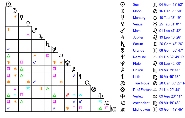 | Sun | 4 Gemini 20 | 4 Gemini 44 | 21 Leo 45 |