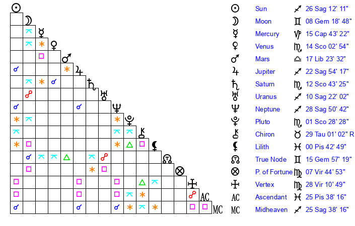 | Sun | 26 Sagittarius 12 | 27 Sagittarius 16 | 7 Aquarius 58 |