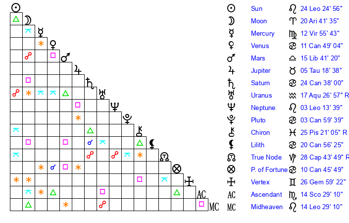 | Neptune | 3 Leo 14 | 1 Aries 40 | 4 Leo 41 |