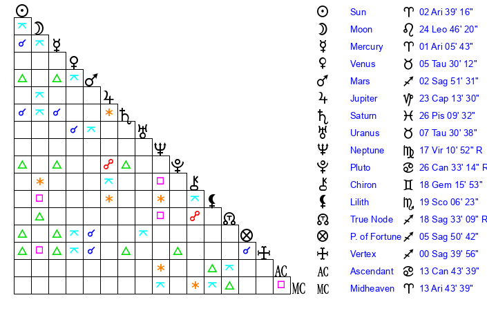 | Sun | 2 Aries 39 | 3 Aries 19 | 27 Gemini 57 |