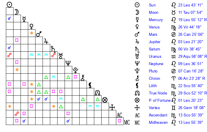 | Sun | 23 Leo 43 | 25 Leo 2 | 8 Sagittarius 27 |
